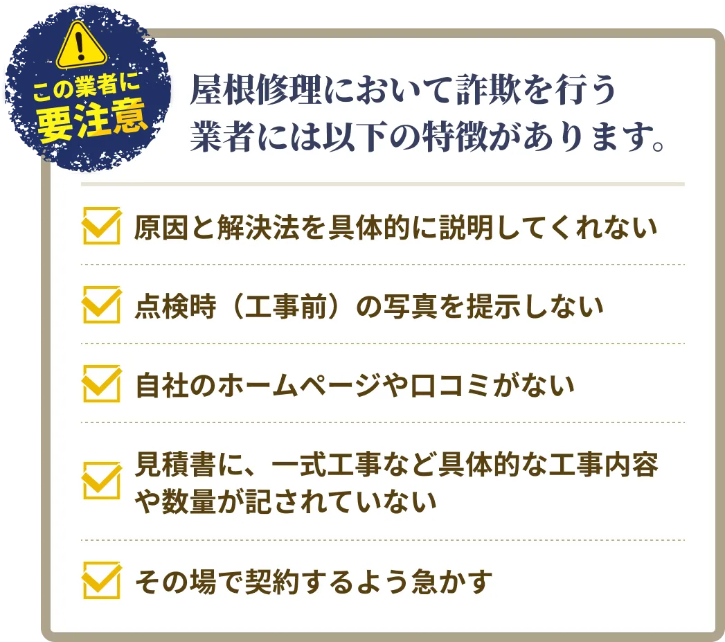 近年、屋根工事はボッタくりや手抜き施工の悪徳業者が多い業界です。